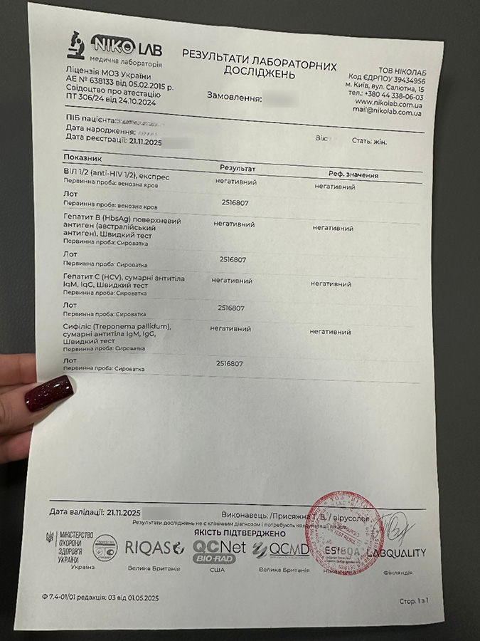 Translation: HIV, hepatitis, syphilis negative (21.11.2025)