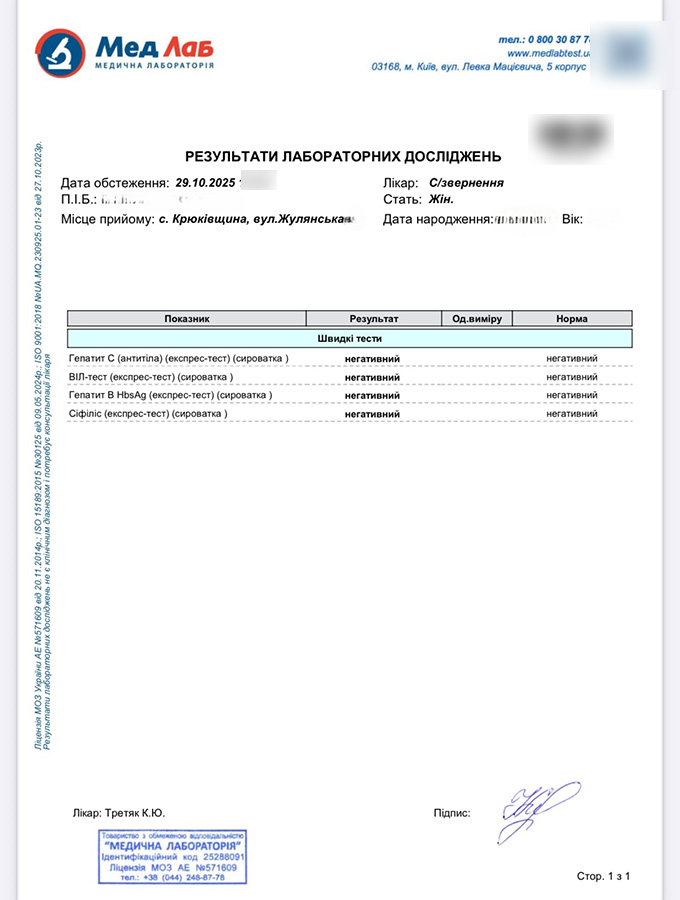 Translation: HIV, hepatitis, syphilis negative (29.10.2025)