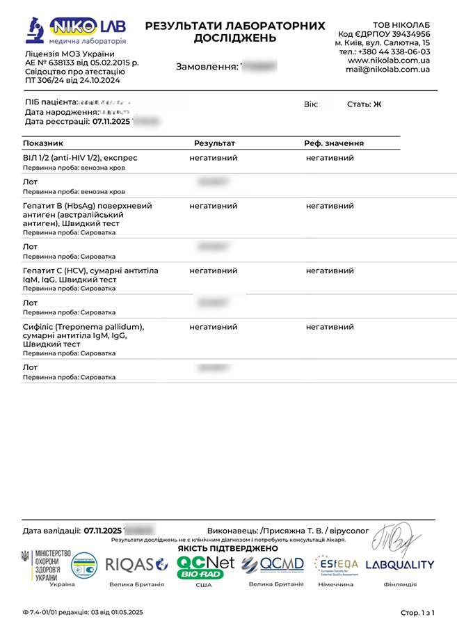 Translation: HIV, hepatitis, syphilis negative (07.11.2025)